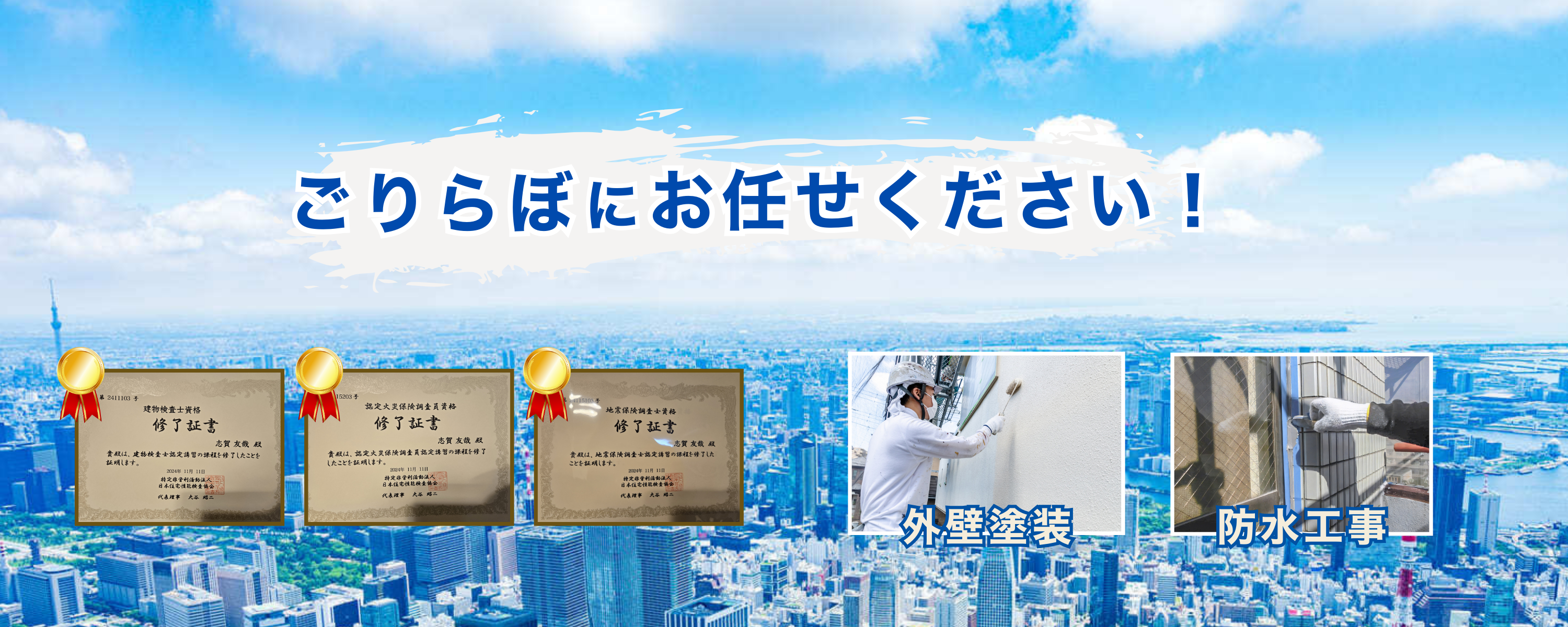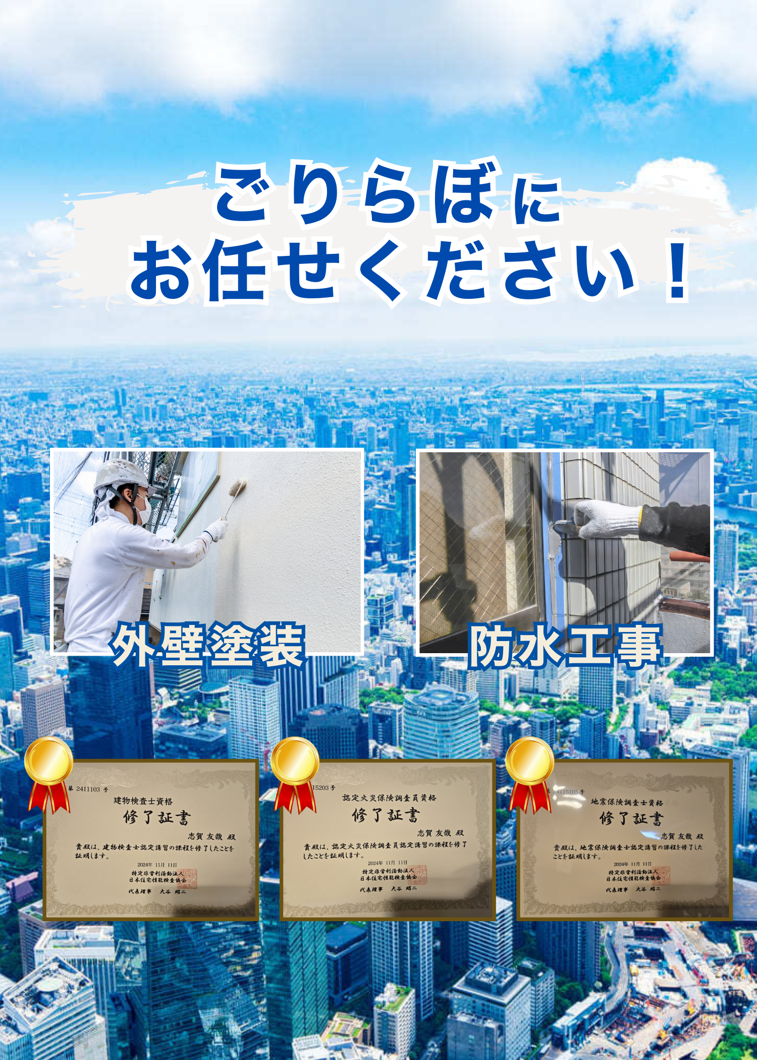 外壁工事や防水工事だけではなく「火災保険調査士」「地震保険調査士」「建物診断士」の資格を保有しており、お客様にプラスになる提案をさせていただいてます。